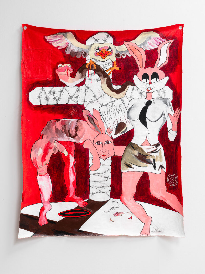 In Chloe-Rose Purcells Arbeiten gibt es fast immer Verweise auf historische Ereignisse, mythologische und christliche Motive, insbesondere auf die christliche Ikonographie, transferiert in eine Art Clipart-Renaissance-Mittelalter-Stil. So findet sich in der Ausstellung wiederkehrend das Motiv des Kaninchens – seit Jahrhunderten ein Symbol für Fruchtbarkeit, in unserer Gegenwart – als „rabbit hole“ bezeichnet – auch Sinnbild für das Verlorengehen im digitalen Informationsnetz.